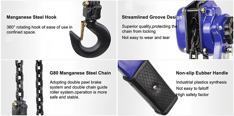 2. নিরাপত্তা এবং স্থায়িত্ব ★ কাঠামোগত সুবিধা • শক্তিশালী মূল উপাদান: মূল অংশ যেমন লোড চেইন (সাধারণত Φ8 মিমি), হুক, গিয়ার এবং হাউজিং 2-টন লোডের জন্য ডিজাইন করা হয়েছে, আরও শক্তিশালী উপকরণ এবং বৃহত্তর মাত্রা ব্যবহার করে। • আরও পরিধান এবং প্রভাব প্রতিরোধী: একই লোড পরিচালনা করার সময় (যেমন, 1 টন), যেহেতু এটি কাজের জন্য "অতিরিক্ত-নির্দিষ্ট" হয়, উপাদানের চাপ তার নকশা সীমার অনেক নীচে থাকে। এটি ধীর পরিধান, দীর্ঘ ক্লান্তি জীবন এবং দুর্ঘটনাজনিত ওভারলোডের জন্য উচ্চ সহনশীলতার দিকে পরিচালিত করে (সীমার মধ্যে)। • উপাদানগুলি (যেমন, Φ6mm বা Φ7mm চেইন) সুনির্দিষ্টভাবে ডিজাইন করা হয়েছে কিন্তু সম্পূর্ণ বা অতিরিক্ত লোডের অধীনে পরিধান এবং বিকৃতির জন্য বেশি সংবেদনশীল।