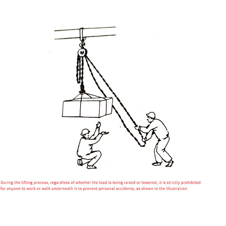 ওভারলোডিং কঠোরভাবে নিষিদ্ধ করুন: উত্তোলনের ওজন কখনই রেট করা লোডের বেশি হওয়া উচিত নয় (নেমপ্লেটে নির্দেশিত)। চেইন টানতে ম্যানুয়াল ফোর্স ছাড়া অন্য কোন শক্তির উৎস ব্যবহার করবেন না।